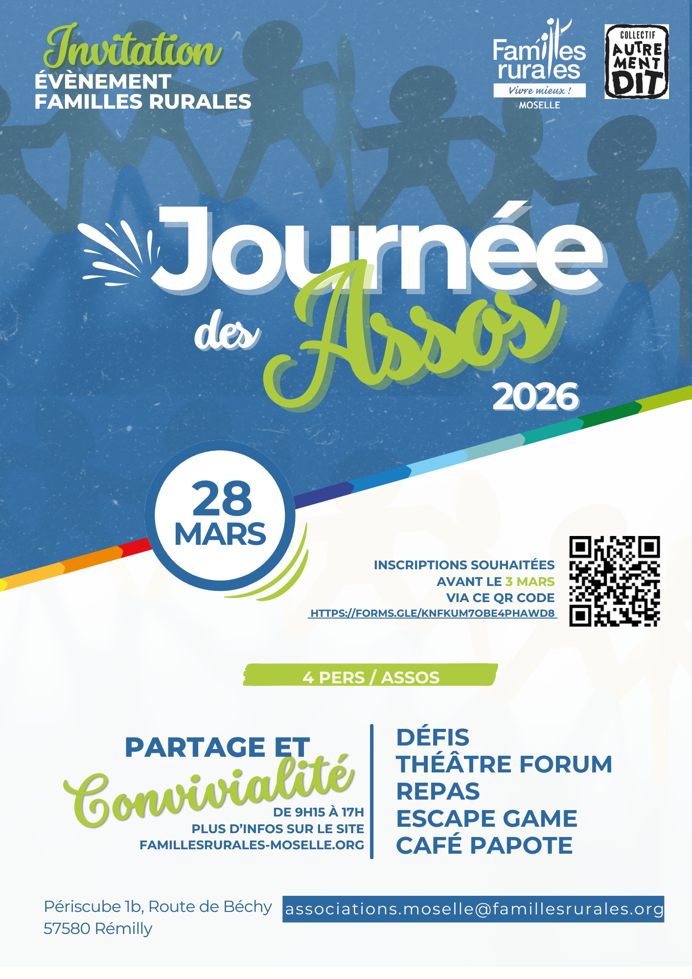 Vous pouvez vous inscrire dès maintenant via le QR Code de l’invitation. Pour toute question relative à l’organisation de cette journée, contactez nous à l’adresse mail : associations.moselle@famillesrurales.org